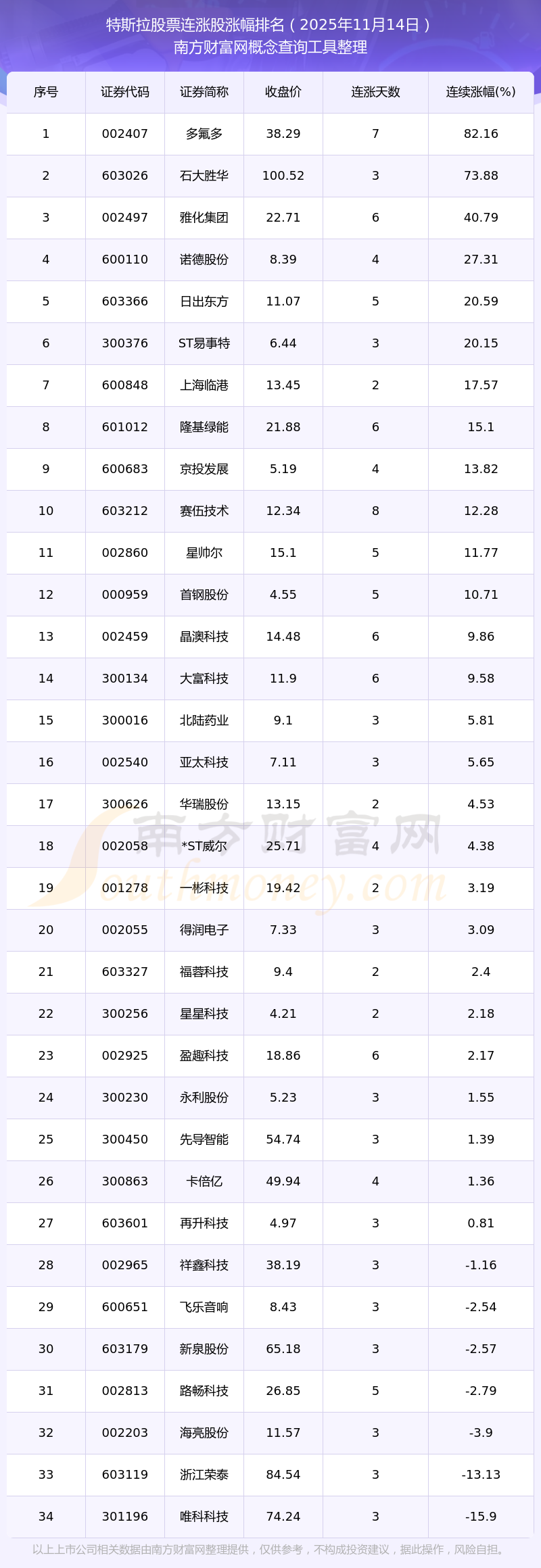 2025年11月14日特斯拉股票連漲股票漲幅排名