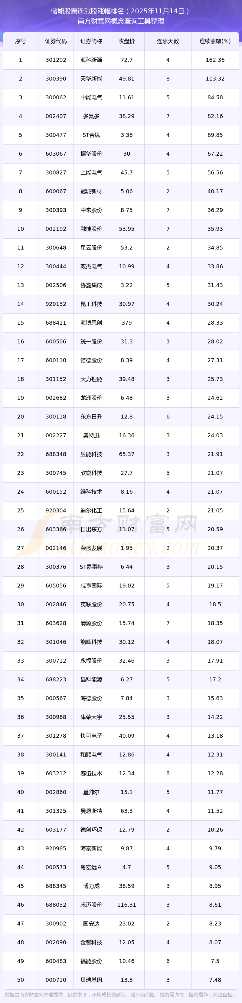 2025年11月14日儲能股票連漲股漲幅排名