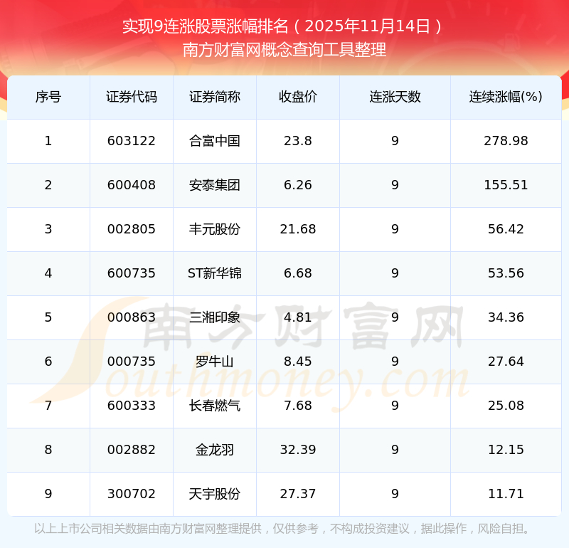 2025年11月14日實現(xiàn)9連漲股票漲幅排名