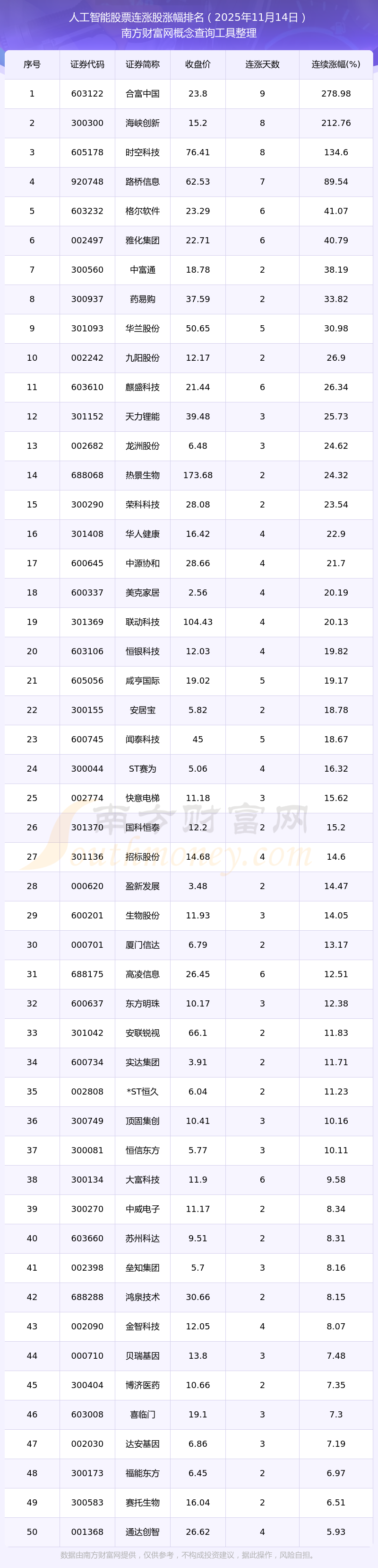 2025年11月14日人工智能股票連漲股漲幅排名
