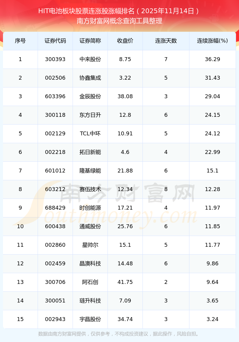 2025年11月14日HIT電池板塊股票連漲股漲幅排名