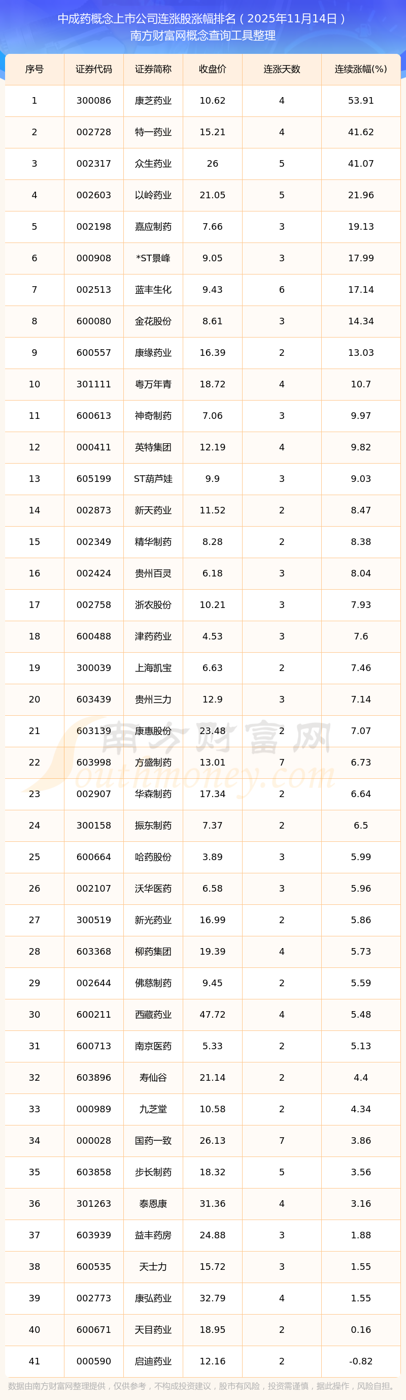 2025年11月14日中成藥概念上市公司連漲股漲幅排名