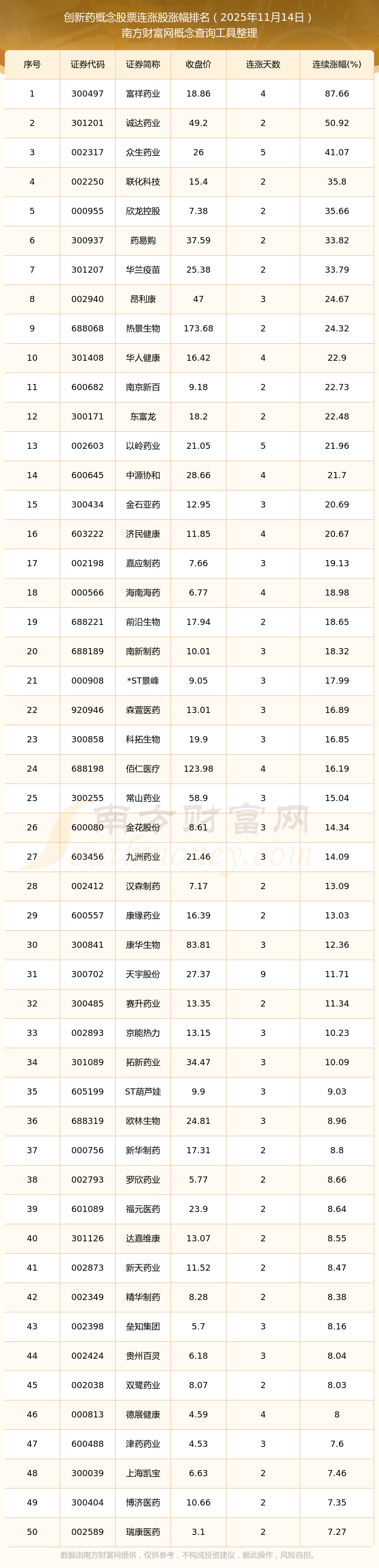 2025年11月14日創(chuàng)新藥概念股票連漲股漲幅排名