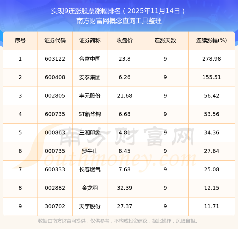 2025年11月14日實(shí)現(xiàn)9連漲股票漲幅排名