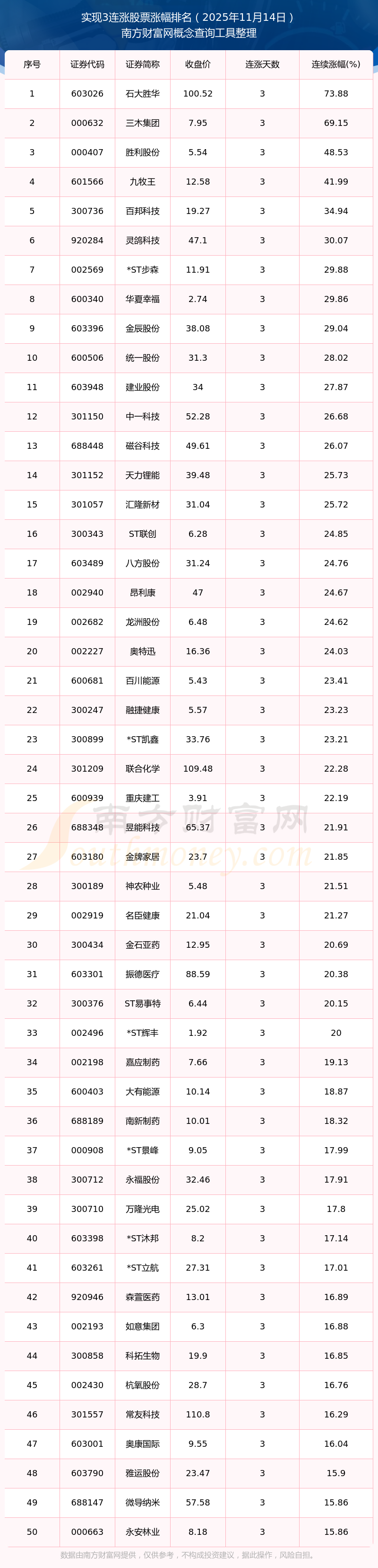2025年11月14日實(shí)現(xiàn)3連漲股票漲幅排名
