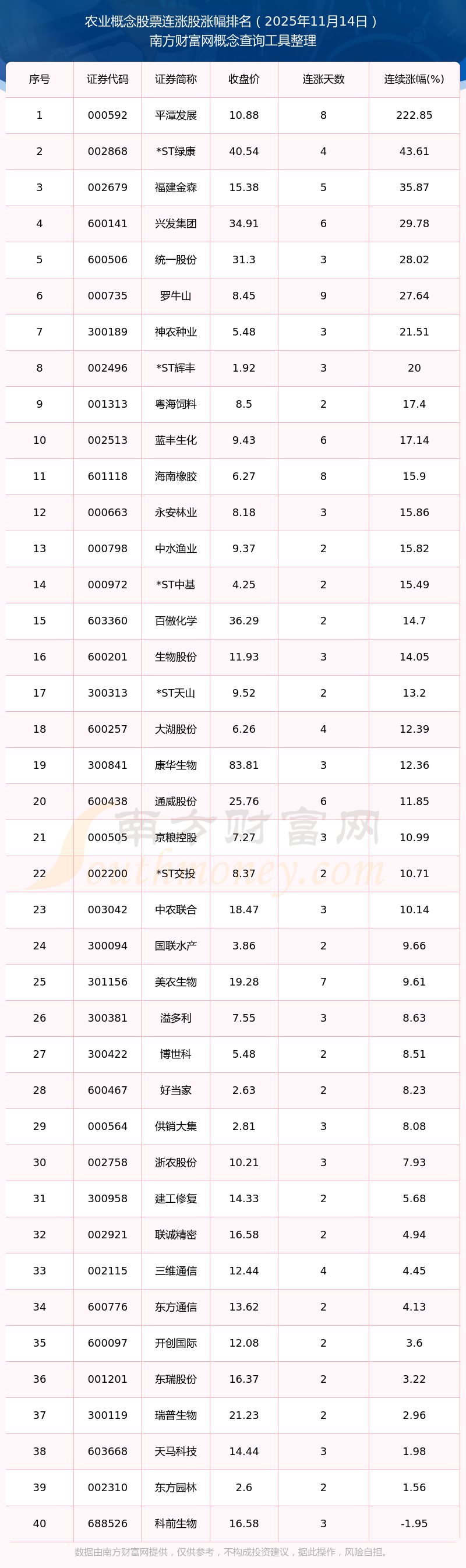 2025年11月14日農(nóng)業(yè)概念股票連漲股漲幅排名
