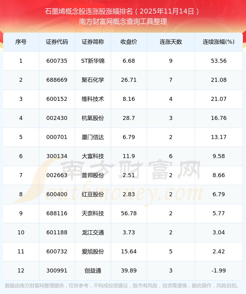 根據(jù)南方財富網(wǎng)概念查詢工具數(shù)據(jù)統(tǒng)計,截止2025年11月14日收盤,石墨烯概念股共有12只個股實現(xiàn)連漲。其中連續(xù)漲幅較大的個股有ST新華錦、聚石化學、維科技術(shù)等,連續(xù)漲幅分別為53.56%、21.08%、21.07%。