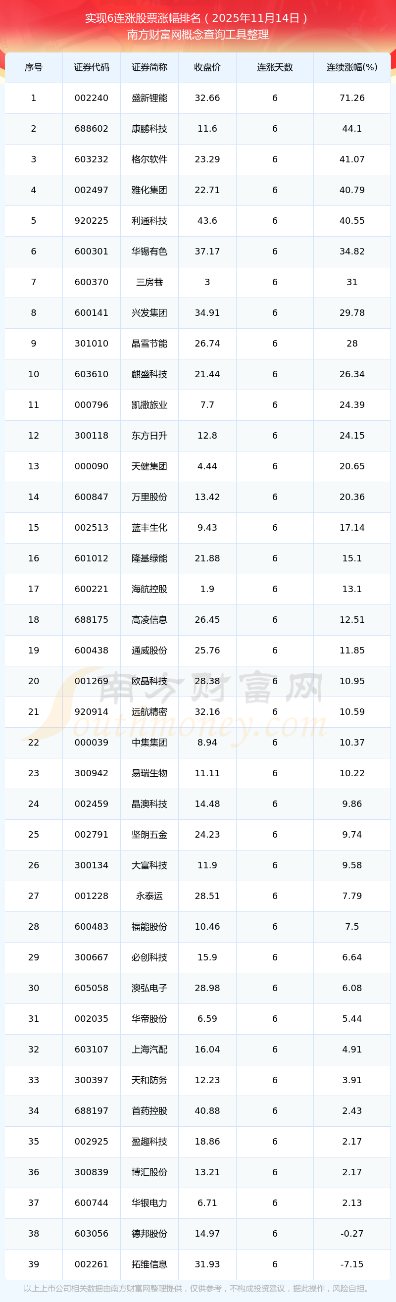 根據(jù)南方財(cái)富網(wǎng)概念查詢工具數(shù)據(jù)統(tǒng)計(jì),截止2025年11月14日收盤(pán),共有39只個(gè)股實(shí)現(xiàn)6天連漲。其中連續(xù)漲幅較大的個(gè)股有盛新鋰能、康鵬科技、格爾軟件等,連續(xù)漲幅分別為71.26%、44.10%、41.07%。