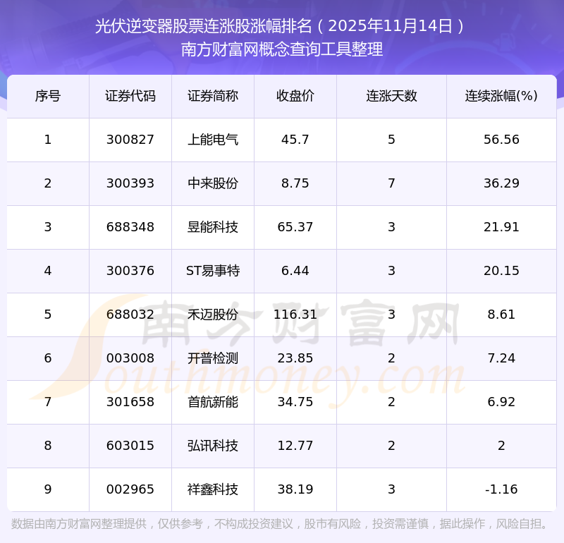 根據(jù)南方財富網(wǎng)概念查詢工具數(shù)據(jù)統(tǒng)計,截止2025年11月14日收盤,光伏逆變器股票共有9只個股實現(xiàn)連漲。其中連續(xù)漲幅較大的個股有上能電氣、中來股份、昱能科技等,連續(xù)漲幅分別為56.56%、36.29%、21.91%。