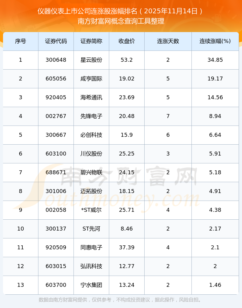 2025年11月14日儀器儀表上市公司連漲股漲幅排名
