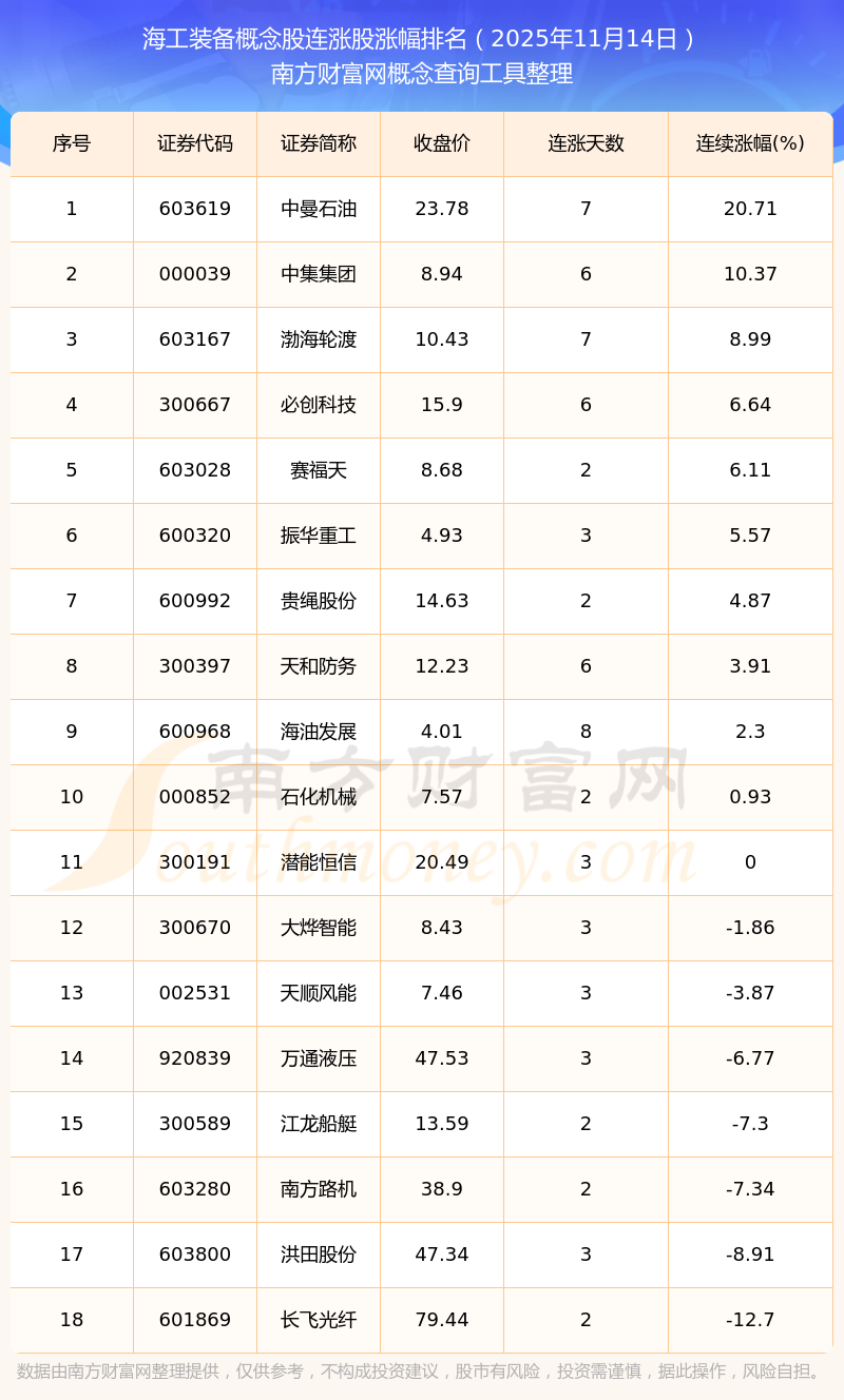 2025年11月14日海工裝備概念股連漲股漲幅排名