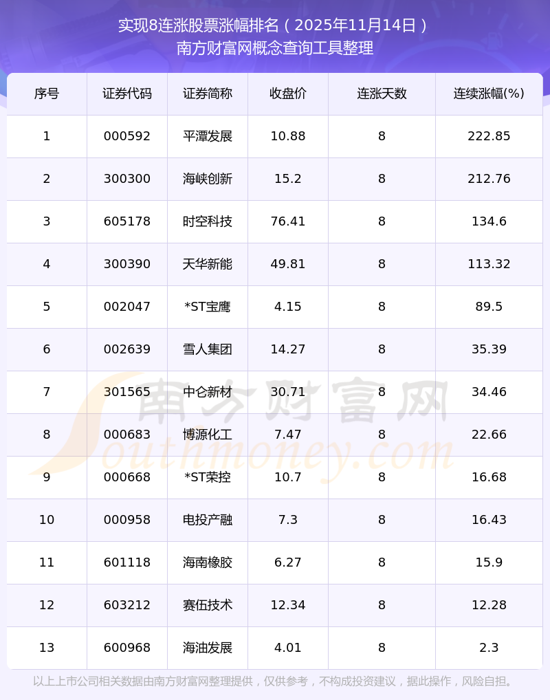 2025年11月14日實(shí)現(xiàn)8連漲股票漲幅排名