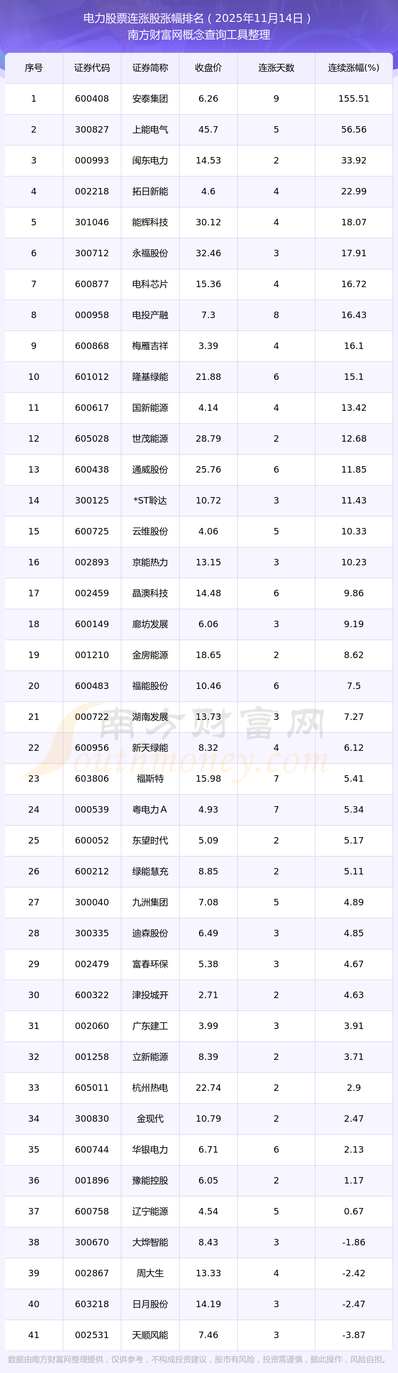 根據(jù)南方財(cái)富網(wǎng)概念查詢工具數(shù)據(jù)統(tǒng)計(jì),截止2025年11月14日收盤,電力股票共有41只個(gè)股實(shí)現(xiàn)連漲。其中連續(xù)漲幅較大的個(gè)股有安泰集團(tuán)、上能電氣、閩東電力等,連續(xù)漲幅分別為155.51%、56.56%、33.92%。