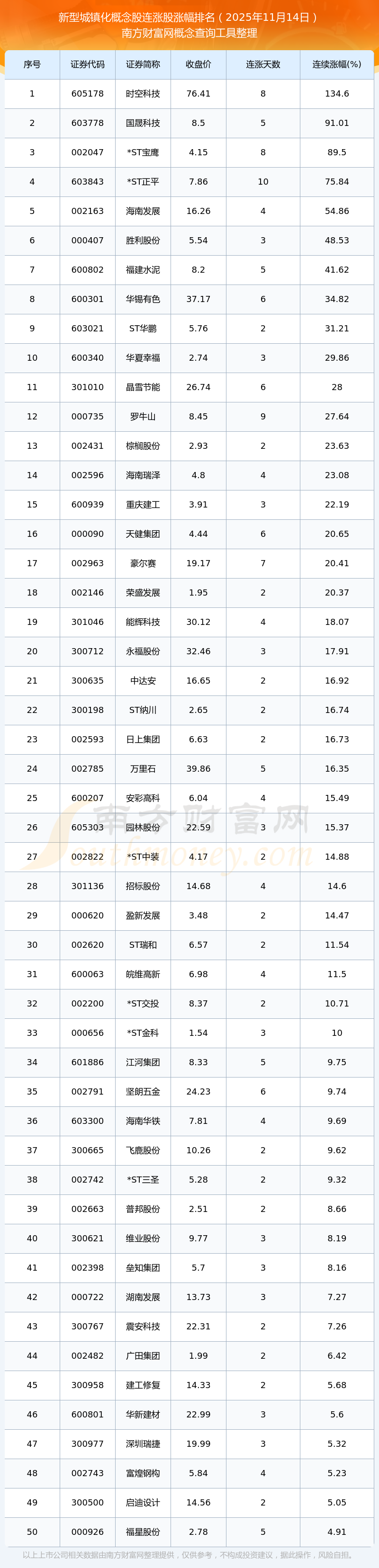2025年11月14日新型城鎮(zhèn)化概念股連漲股漲幅排名