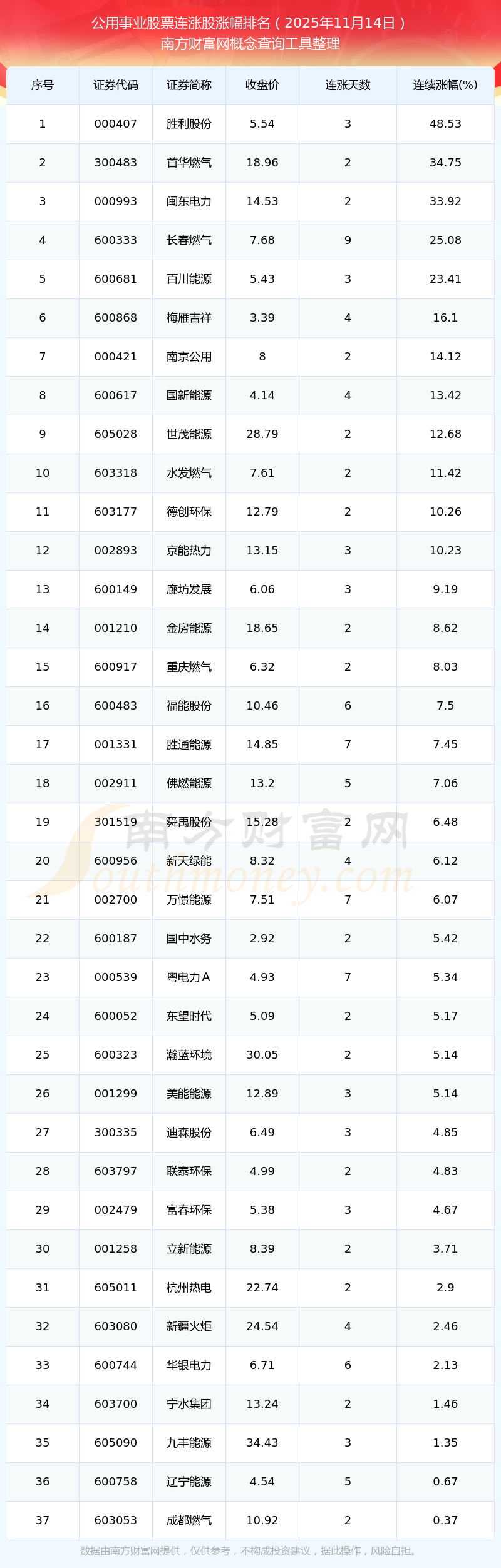 2025年11月14日公用事業(yè)股票連漲股漲幅排名
