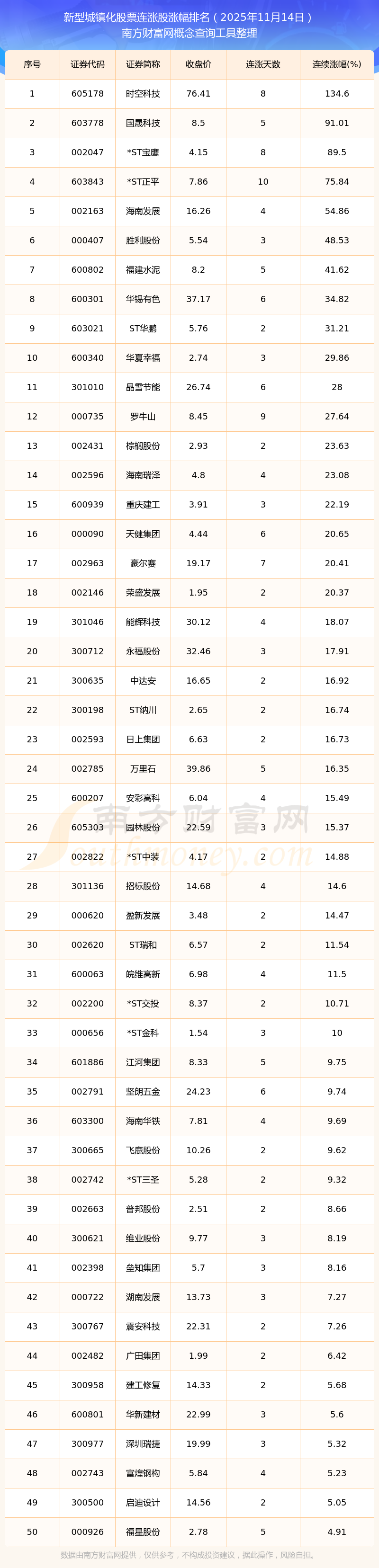 2025年11月14日新型城鎮(zhèn)化股票連漲股漲幅排名