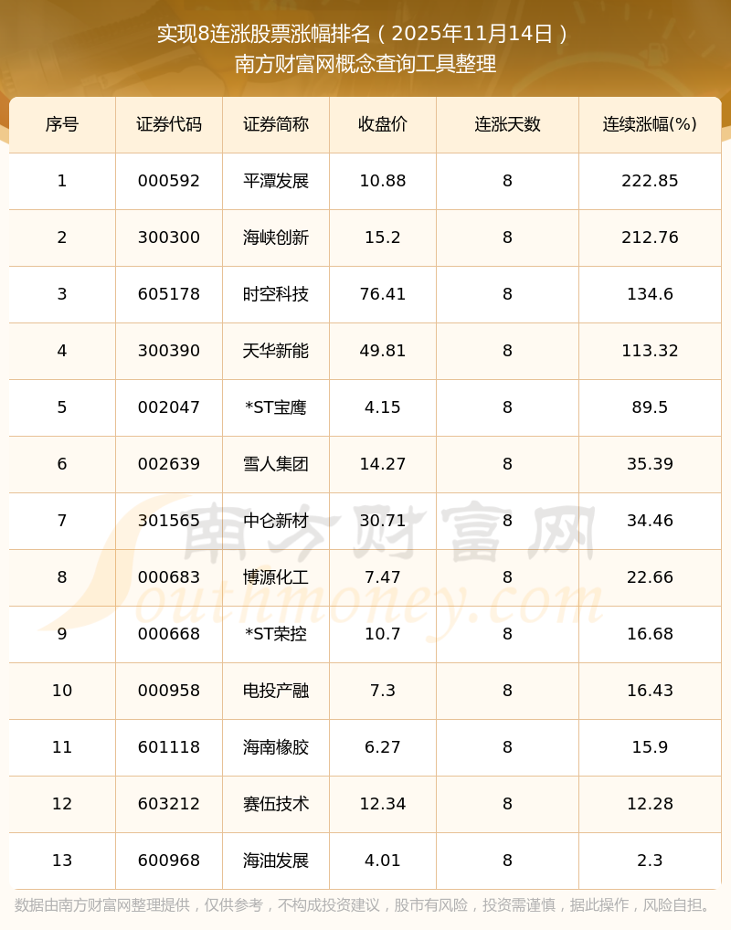2025年11月14日實(shí)現(xiàn)8連漲股票漲幅排名