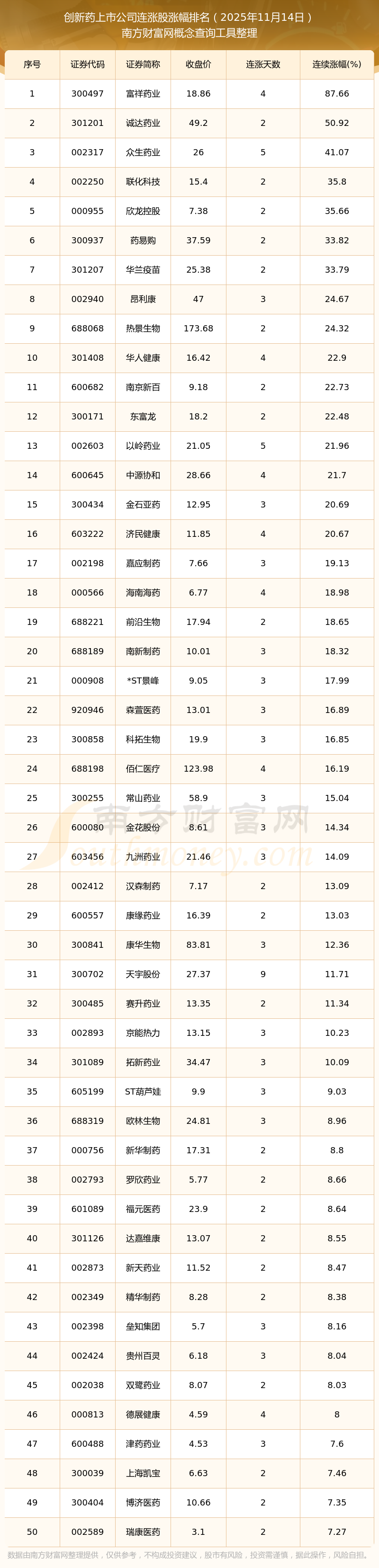 2025年11月14日創(chuàng)新藥上市公司連漲股漲幅排名