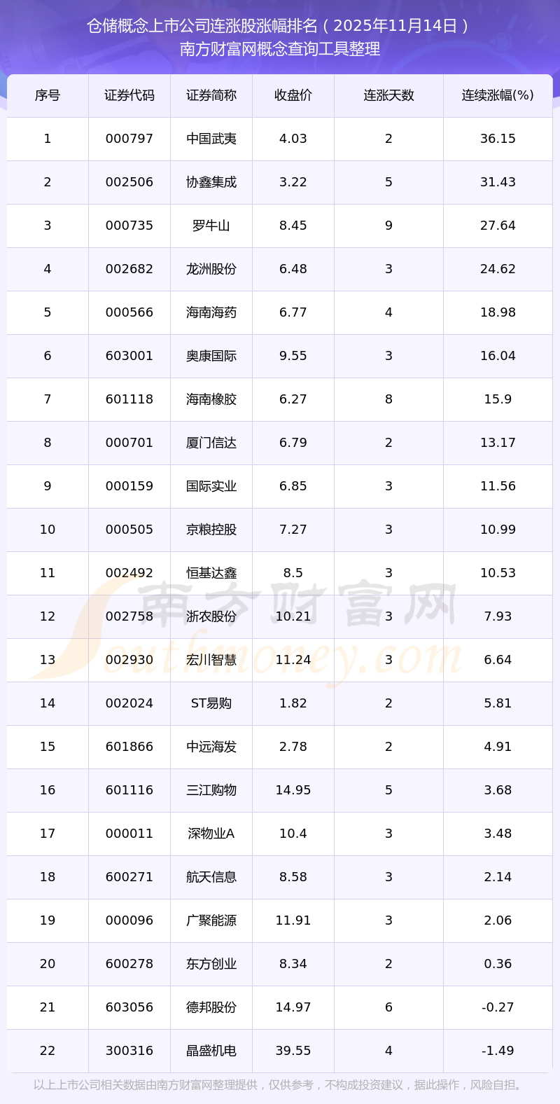 2025年11月14日倉(cāng)儲(chǔ)概念上市公司連漲股漲幅排名