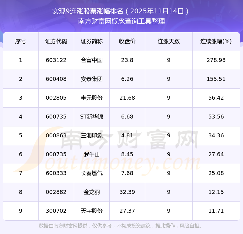 根據(jù)南方財富網(wǎng)概念查詢工具數(shù)據(jù)統(tǒng)計,截止2025年11月14日收盤,共有9只個股實現(xiàn)9天連漲。其中連續(xù)漲幅較大的個股有合富中國、安泰集團、豐元股份等,連續(xù)漲幅分別為278.98%、155.51%、56.42%。