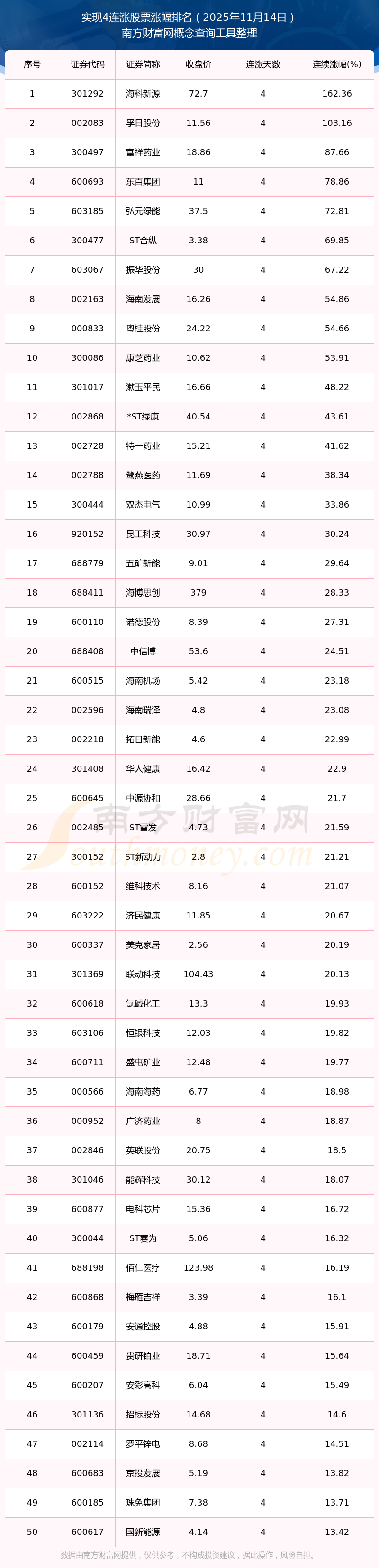 2025年11月14日實現(xiàn)4連漲股票漲幅排名