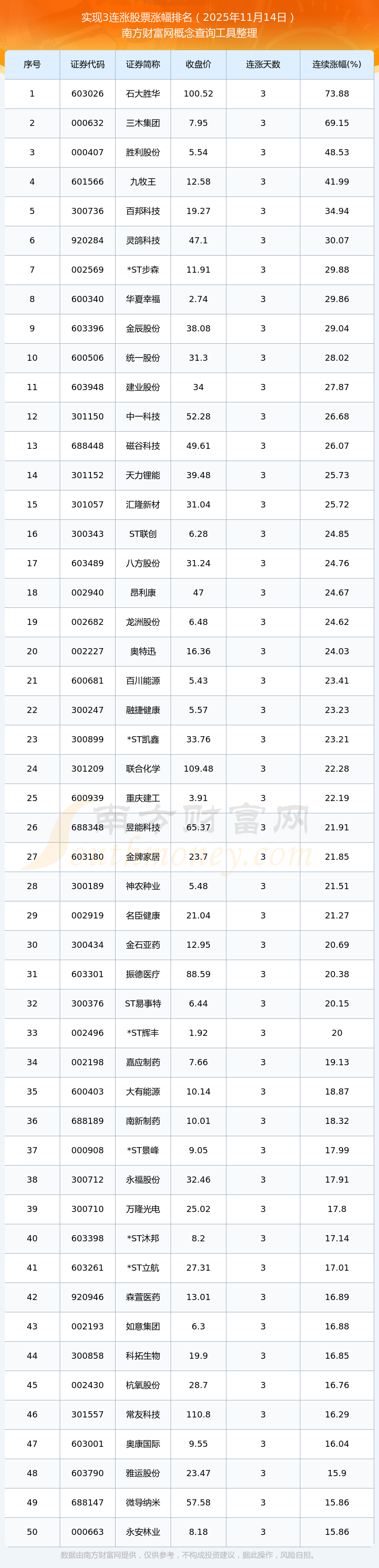 根據(jù)南方財富網(wǎng)概念查詢工具數(shù)據(jù)統(tǒng)計,截止2025年11月14日收盤,共有219只個股實現(xiàn)3天連漲。其中連續(xù)漲幅較大的個股有石大勝華、三木集團、勝利股份等,連續(xù)漲幅分別為73.88%、69.15%、48.53%。