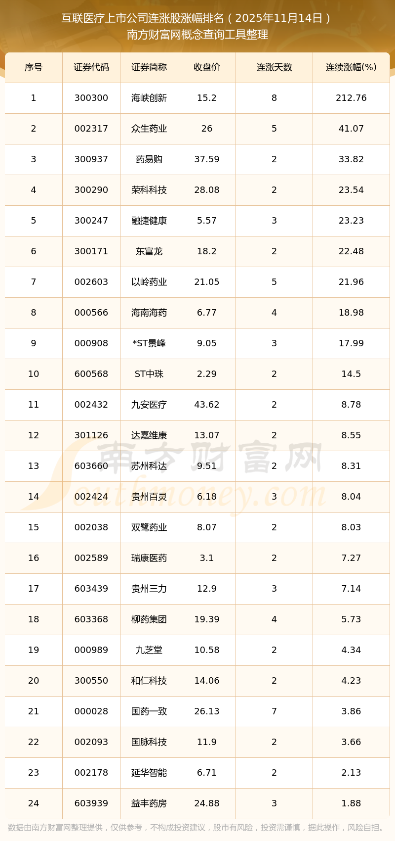 2025年11月14日互聯(lián)醫(yī)療上市公司連漲股漲幅排名