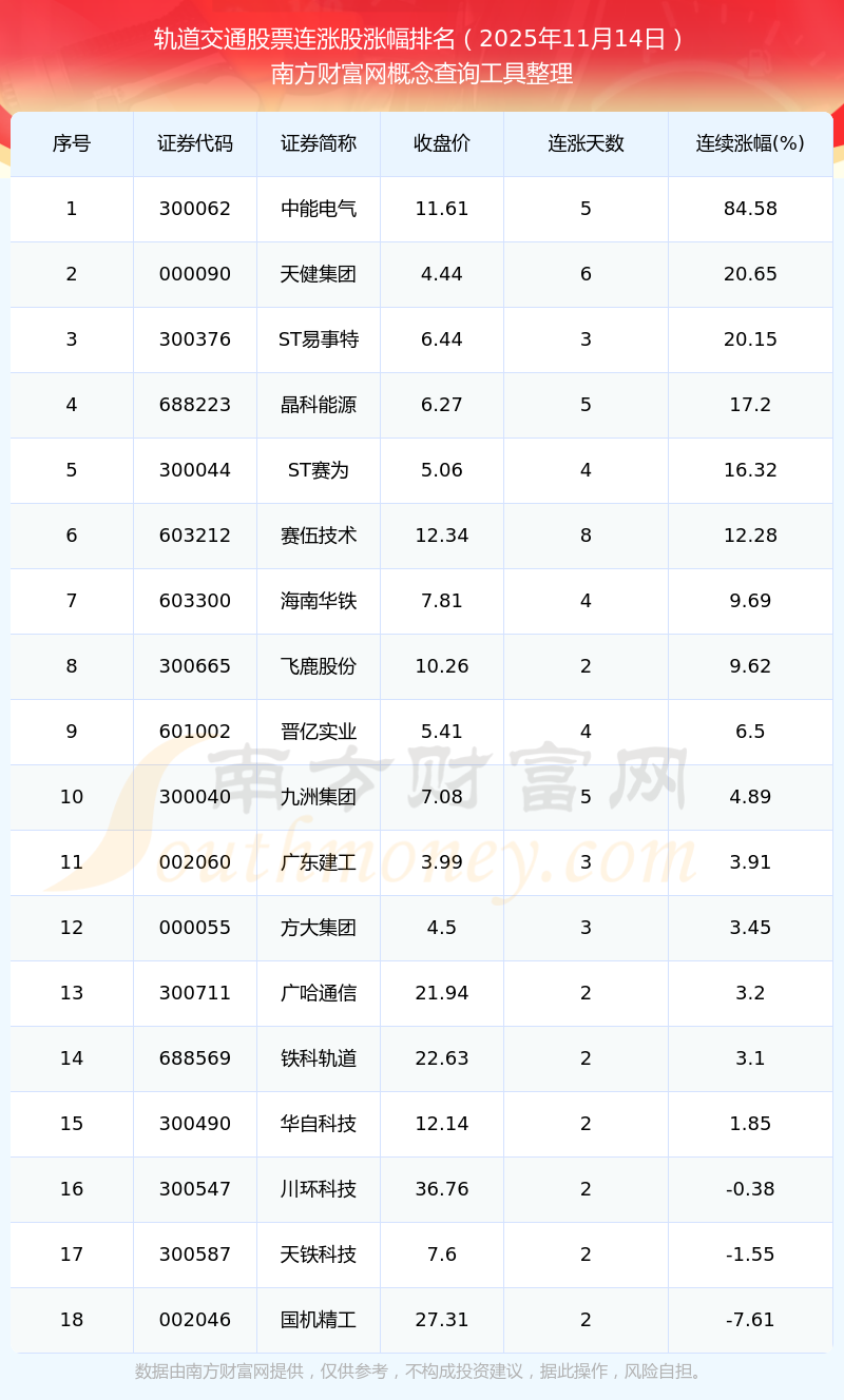 2025年11月14日軌道交通股票連漲股漲幅排名