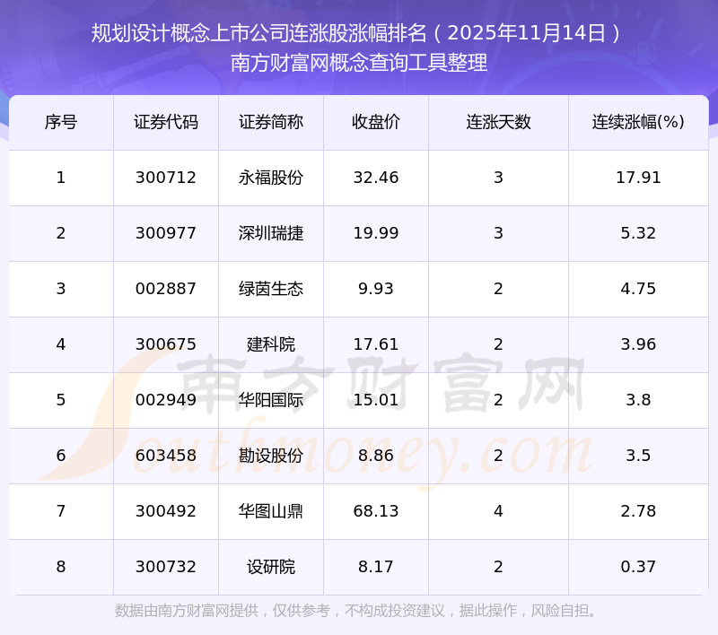 2025年11月14日規(guī)劃設(shè)計概念上市公司連漲股漲幅排名