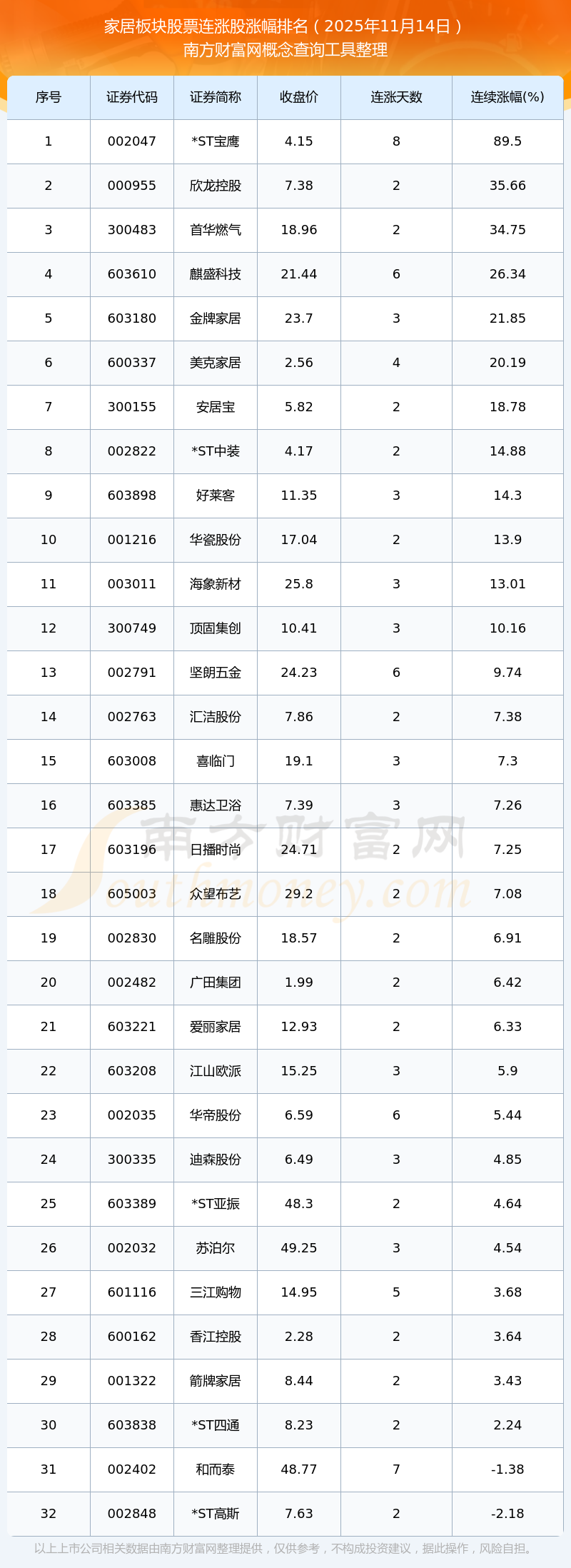 2025年11月14日家居板塊股票連漲股漲幅排名