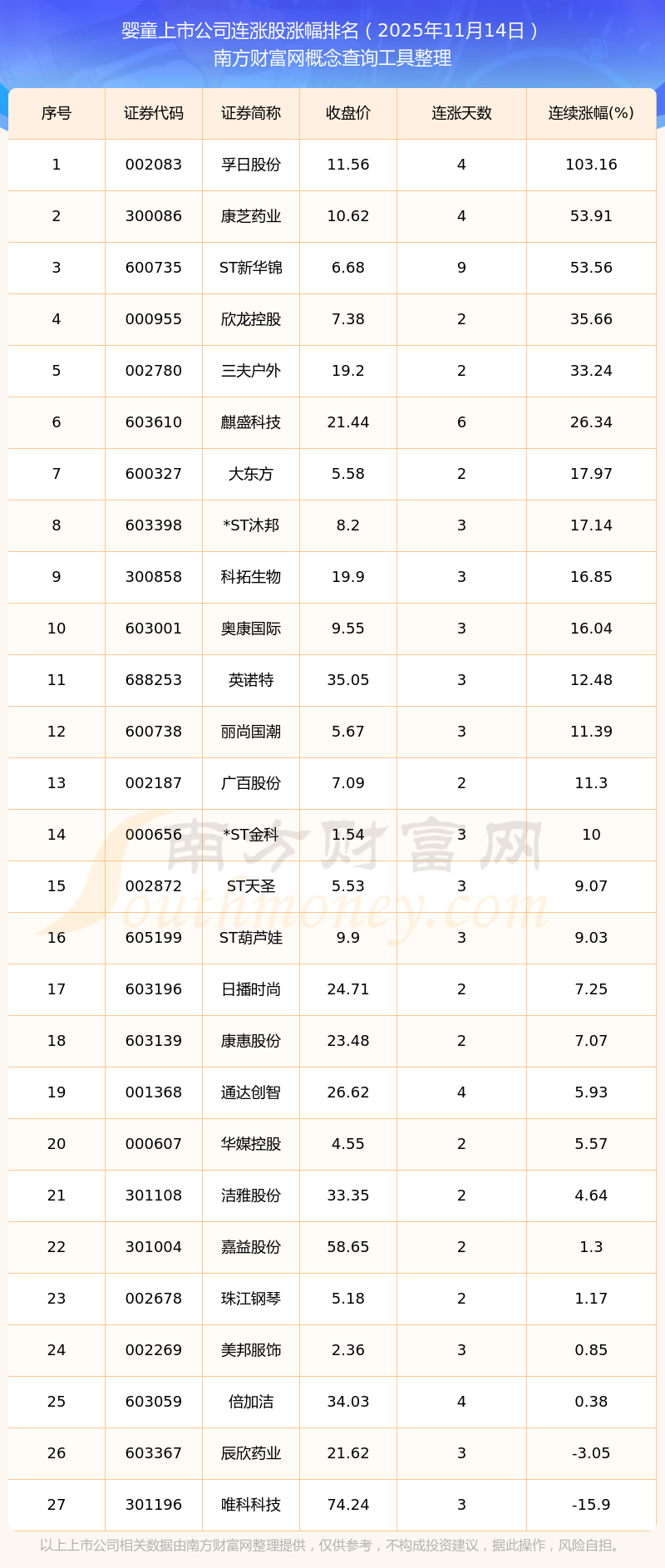 2025年11月14日嬰童上市公司連漲股票漲幅排名