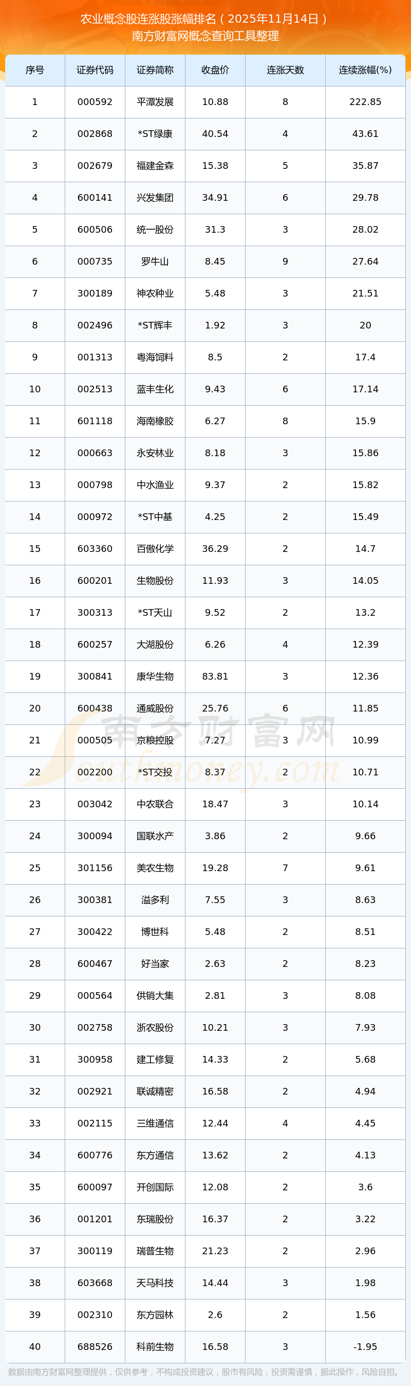 2025年11月14日農(nóng)業(yè)概念股連漲股漲幅排名