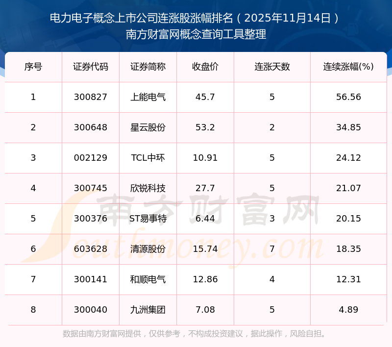 2025年11月14日電力電子概念上市公司連漲股漲幅排名