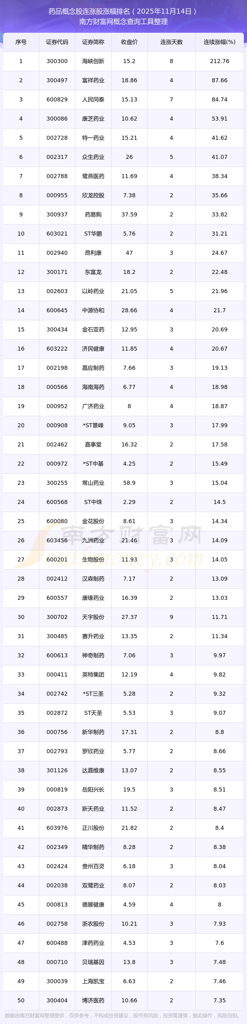 根據(jù)南方財富網(wǎng)概念查詢工具數(shù)據(jù)統(tǒng)計,截止2025年11月14日收盤,藥品概念股共有87只個股實現(xiàn)連漲。其中連續(xù)漲幅較大的個股有海峽創(chuàng)新、富祥藥業(yè)、人民同泰等,連續(xù)漲幅分別為212.76%、87.66%、84.74%。
