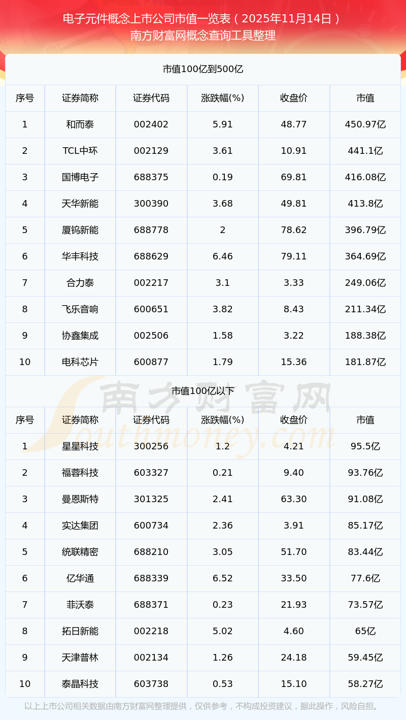 截止2025年11月14日,電子元件概念上市公司中福蓉科技、晶豐明源、實(shí)達(dá)集團(tuán)、統(tǒng)聯(lián)精密等52家市值位于不足100億之列;環(huán)旭電子、士蘭微、宏發(fā)股份、匯頂科技等36家市值位于100億到500億之列;生益電子、瑞芯微、三安光電、長(zhǎng)電科技等6家市值位于500億到1000億之列;豪威集團(tuán)、瀾起科技、生益科技等4家市值位于1000億到2000億之列;寒武紀(jì)市值位于5000億到10000億之列。