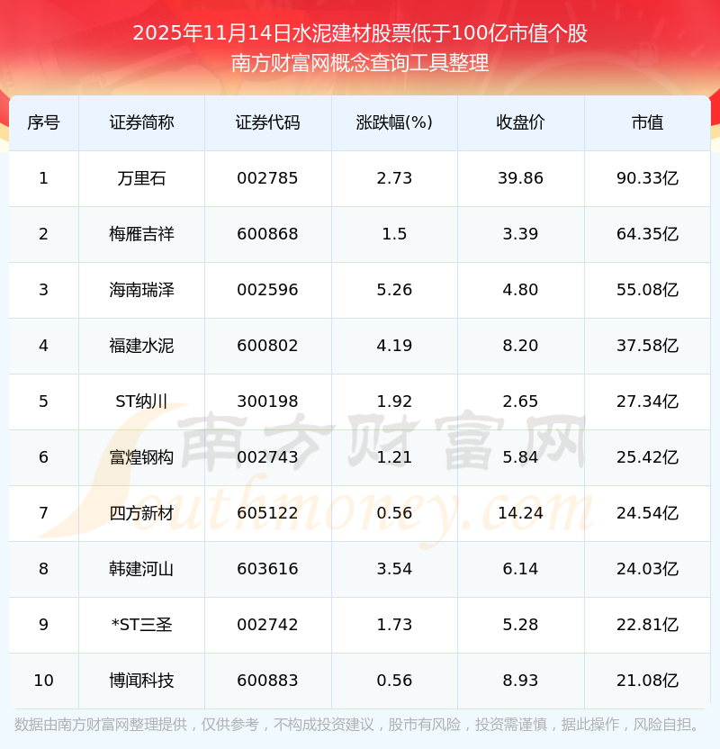 截止2025年11月14日,水泥建材股票市值低于100億的個股共有10只。其中,市值較高的有萬里石、梅雁吉祥、海南瑞澤,市值分別為90.33億元、64.35億元、55.08億元。