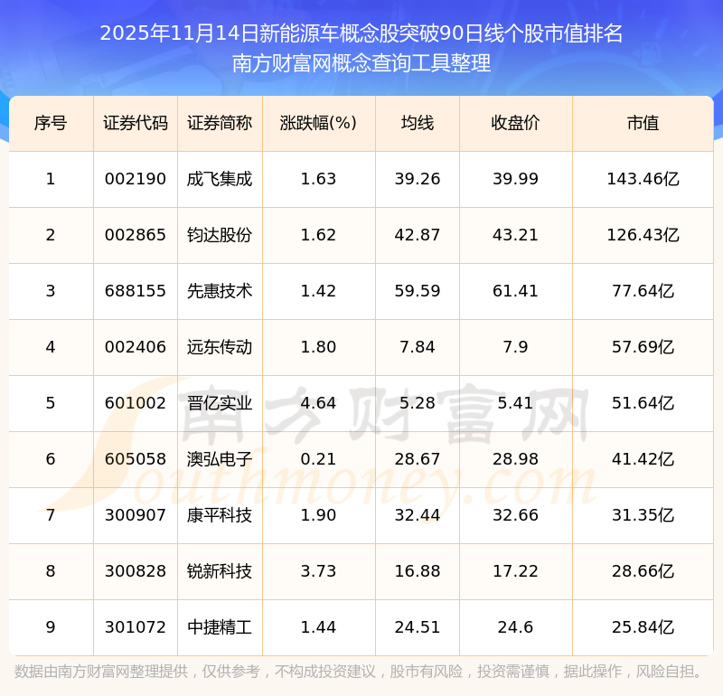 根據(jù)南方財富網(wǎng)概念查詢工具數(shù)據(jù)統(tǒng)計,截止2025年11月14日收盤,新能源車概念股共有9只個股收盤價向上突破了90日線。其中市值較大的個股有成飛集成、鈞達(dá)股份、先惠技術(shù)等,市值分別為143.46億、126.43億、77.06億。