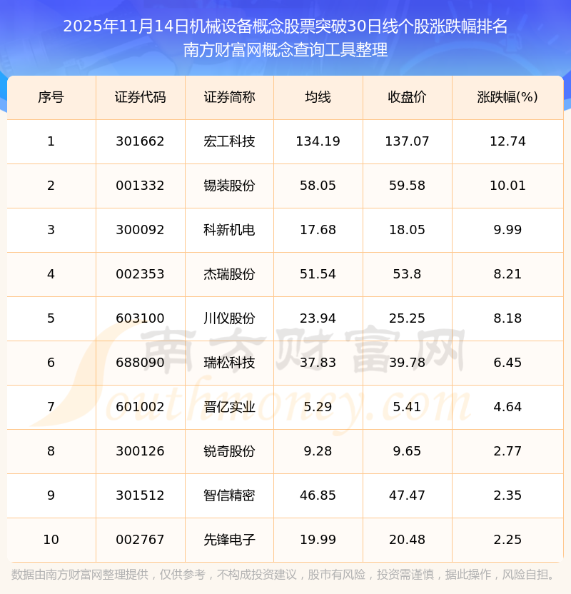 2025年11月14日機(jī)械設(shè)備概念股票突破30日線個(gè)股漲跌幅排名