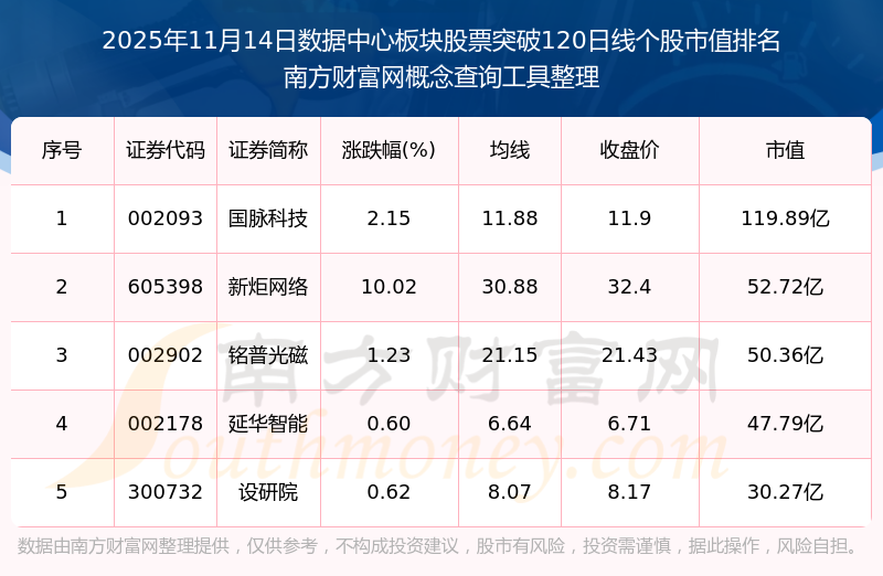 2025年11月14日數(shù)據(jù)中心板塊股票突破120日線個(gè)股市值排名