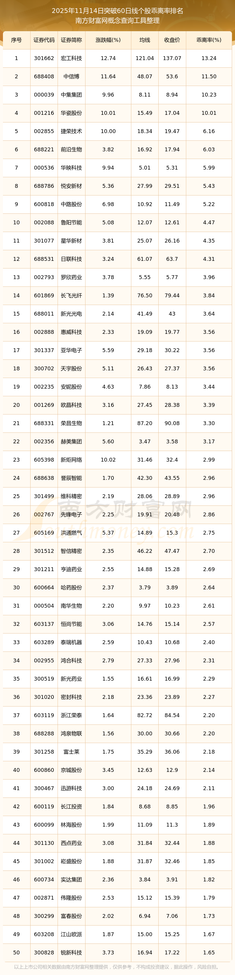 根據(jù)南方財富網(wǎng)概念查詢工具數(shù)據(jù)統(tǒng)計,截止2025年11月14日收盤,共有108只個股收盤價向上突破了60日線,其中乖離率較大的個股有宏工科技、中信博、中集集團(tuán)、華瓷股份、捷榮技術(shù)等,乖離率分別為13.24%、11.50%、10.23%、10.01%、6.16%。