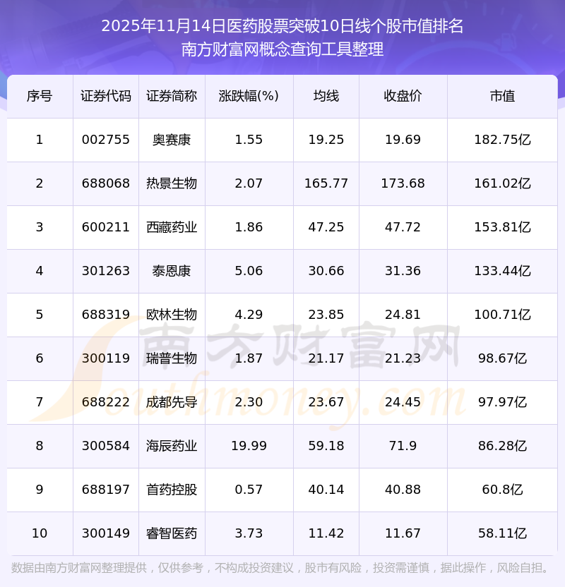 2025年11月14日醫(yī)藥股票突破10日線個股市值排名