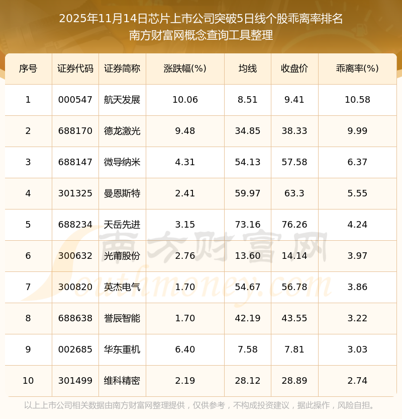 2025年11月14日芯片上市公司突破5日線個股乖離率排名