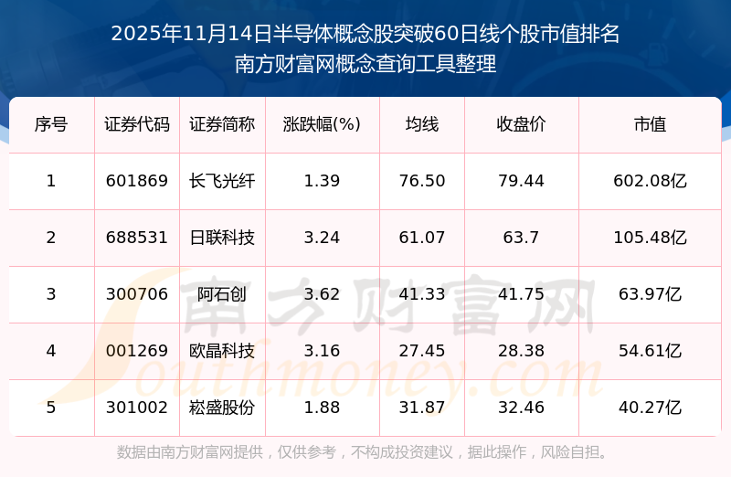 2025年11月14日半導(dǎo)體概念股突破60日線個股市值排名