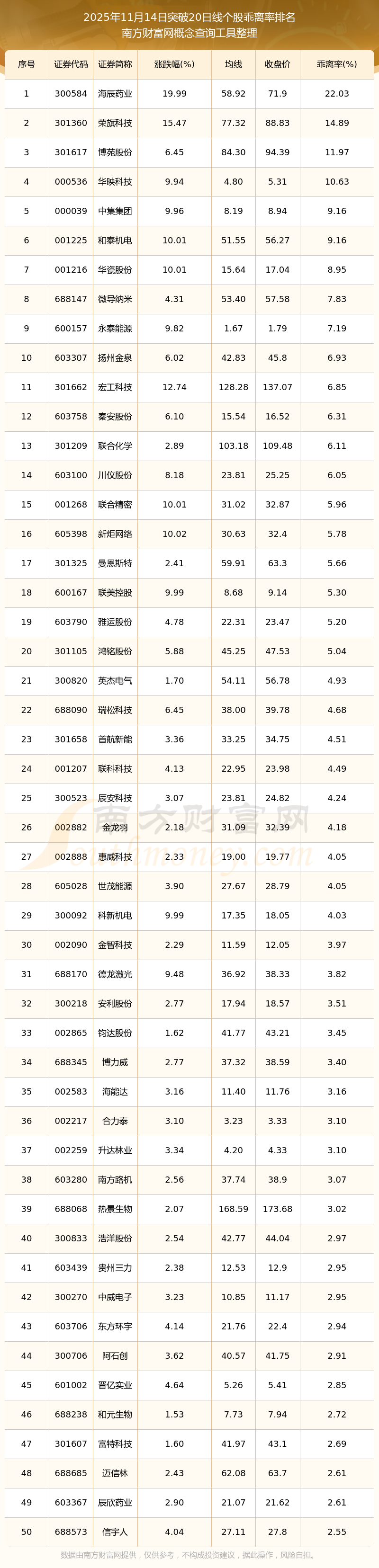 根據(jù)南方財富網(wǎng)概念查詢工具數(shù)據(jù)統(tǒng)計,截止2025年11月14日收盤,共有108只個股收盤價向上突破了20日線,其中乖離率較大的個股有海辰藥業(yè)、榮旗科技、博苑股份、華映科技、中集集團(tuán)等,乖離率分別為22.03%、14.89%、11.97%、10.63%、9.16%。