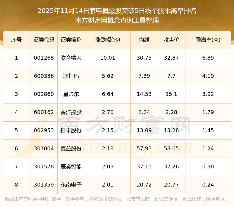 根據(jù)南方財(cái)富網(wǎng)概念查詢工具數(shù)據(jù)統(tǒng)計(jì),截止2025年11月14日收盤(pán),家電概念股共有8只個(gè)股收盤(pán)價(jià)向上突破了5日線。其中乖離率較大的個(gè)股有聯(lián)合精密、澳柯瑪、星帥爾等,乖離率分別為6.89%、4.19%、3.92%。