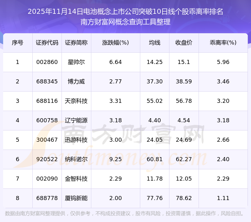 2025年11月14日電池概念上市公司突破10日線個(gè)股乖離率排名