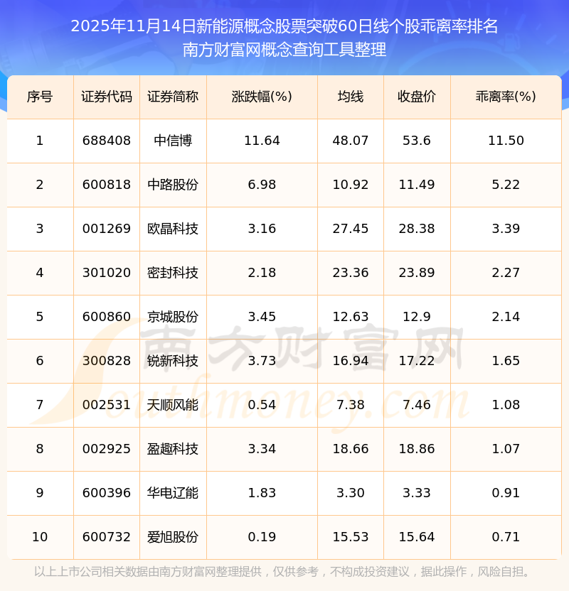 2025年11月14日新能源概念股票突破60日線(xiàn)個(gè)股乖離率排名