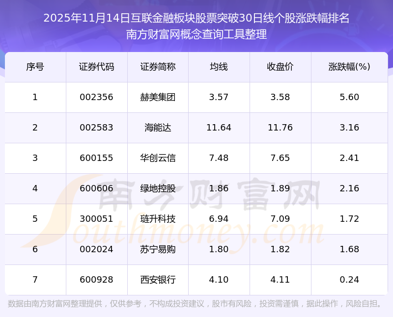 2025年11月14日互聯(lián)金融板塊股票突破30日線個(gè)股漲跌幅排名
