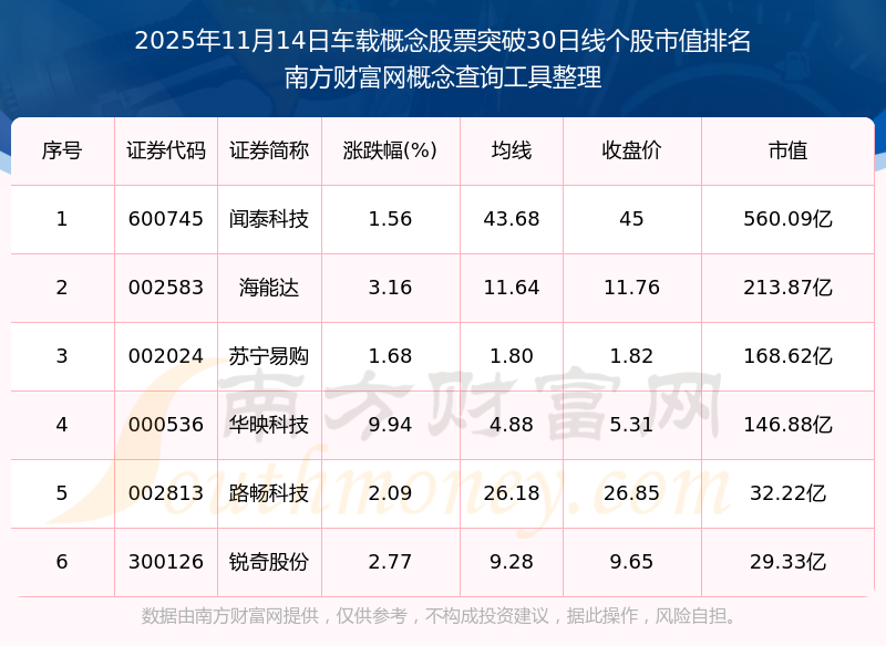 根據(jù)南方財(cái)富網(wǎng)概念查詢工具數(shù)據(jù)統(tǒng)計(jì),截止2025年11月14日收盤(pán),車載概念股票共有6只個(gè)股收盤(pán)價(jià)向上突破了30日線。其中市值較大的個(gè)股有聞泰科技、海能達(dá)、蘇寧易購(gòu)等,市值分別為560.09億、213.87億、168.62億。
