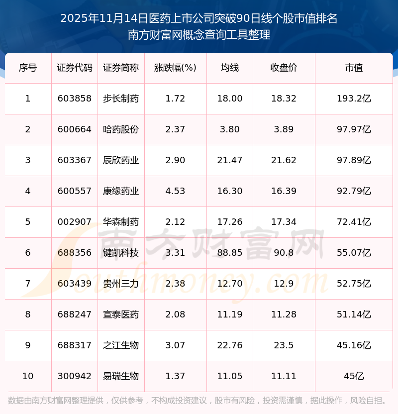 2025年11月14日醫(yī)藥上市公司突破90日線個股市值排名